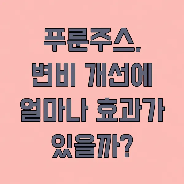 - Q4: 푸룬주스 대신 말린 푸룬을 먹어도 효과가 똑같나요? A: 말린 푸룬도 식이섬유와 소르비톨이 풍부하여 변비 개선에 도움을 줍니다. 다만, 주스 형태가 흡수나 섭취 용이성 면에서 더 나을 수 있습니다. 개인의 선호도에 따라 선택하시면 됩니다.